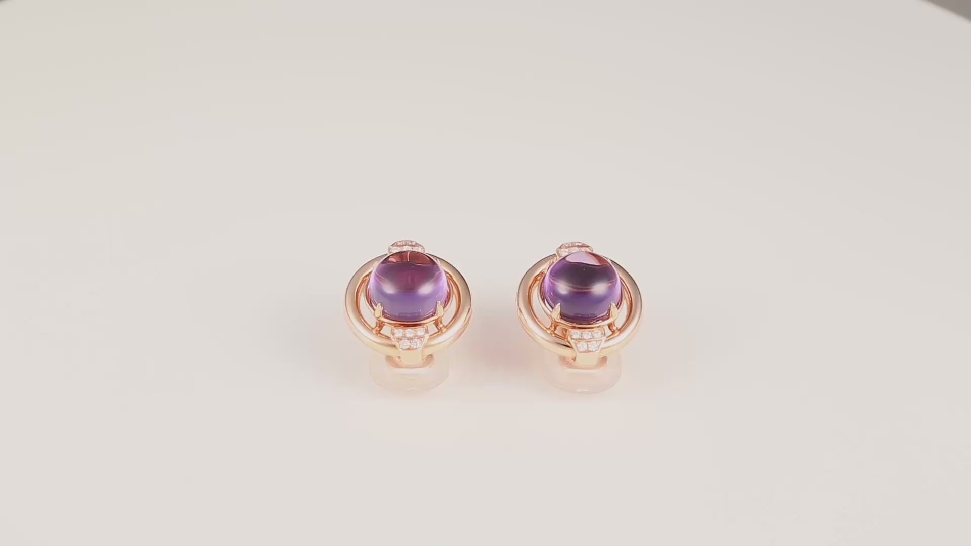 作品甄选柔和的薰衣草色调紫水晶为主石,悬浮于金环之心,仿佛行星在轨道间守护的浪漫。细密镶嵌的天然钻石环扣两端,宛若流星划过星轨,闪烁着灵动的光。宝石的清澈光亮与玫瑰金的温润色彩交织,营造出轻盈、灵动、且充满现代感的愉悦。